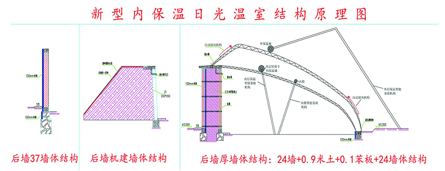 新型內保溫日光溫室在光照強度、溫度均高于普通溫室,新型內保溫日光溫室具有更好的光照條件和保溫性能,根據墻體不同可分為:磚夾土型內保溫日光溫室、機建厚墻體型內保溫日光溫室、37墻體型內保溫日光溫室。針對北方酷寒氣候條件研發抗風雪型、適合大風、寒冷氣候特點;主要選擇適合北方可在冬季不加溫的條件下實現果菜類蔬菜生產的新型內保溫日光溫室。
