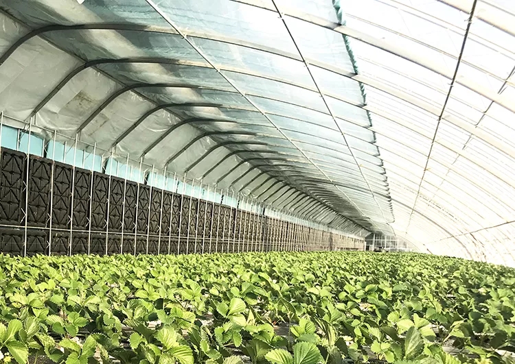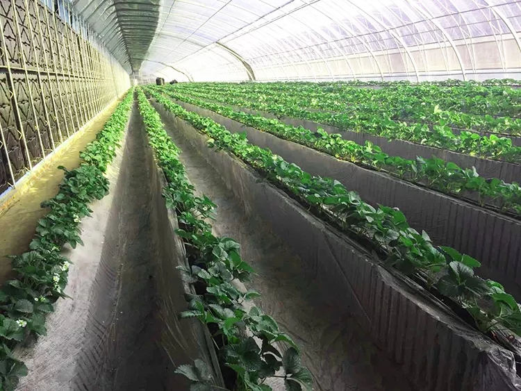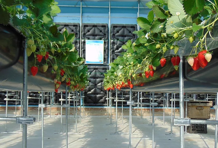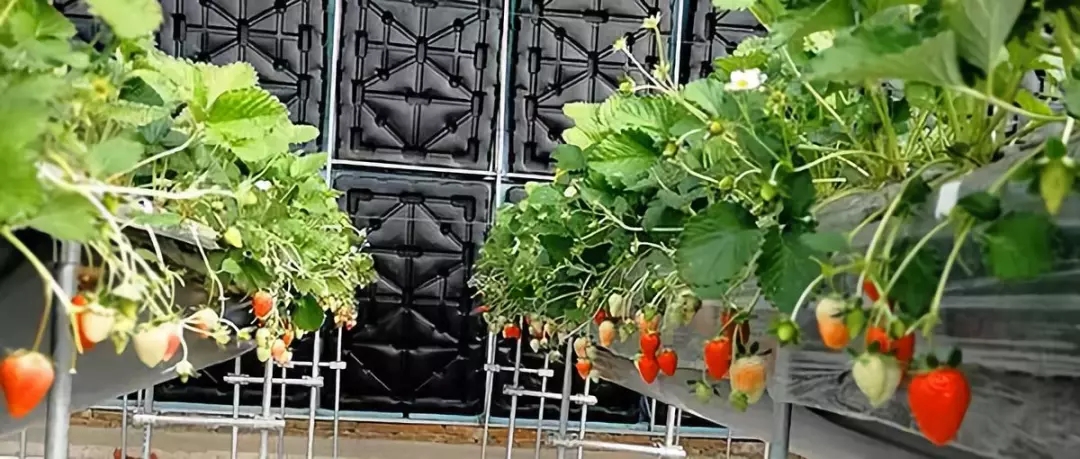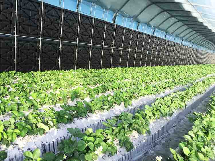 為了達(dá)到合理蓄熱的目的,日光溫室蓄熱系統(tǒng)也經(jīng)歷了土墻、磚墻墻體保溫到相變材料的不斷更新。受傳統(tǒng)日光溫室蓄熱材料粘土或磚本身的物理性質(zhì)的限制,能達(dá)到的蓄熱量有限。理論上,選用比熱容更高的水可能會收獲更多蓄熱量。粘土或磚的比熱容分別僅為水的1/3和1/4,也就是說單位質(zhì)量的水蓄熱內(nèi)外雙保溫裝配式日光溫室蓄熱體每升高或降低1℃可以吸收或放出的熱量是土墻或磚墻3~4倍。實(shí)踐證明,水蓄熱墻體的蓄熱能力顯著強(qiáng)于土墻或磚墻。崔世茂教授介紹說,在水蓄熱內(nèi)外雙保溫裝配式日光溫室中,水箱墻體蓄熱方面有明顯創(chuàng)新,蓄熱技術(shù)主要是利用太陽能白天照射加溫水箱,晚上通過水箱持續(xù)放熱保持溫室內(nèi)溫度可達(dá)到6 ℃以上(同期室外氣溫-30 ℃),夜間增溫效果顯著,這樣就能夠保證溫室中越冬生產(chǎn)栽培的草莓和番茄可以正常生長,產(chǎn)量高、品質(zhì)好!
