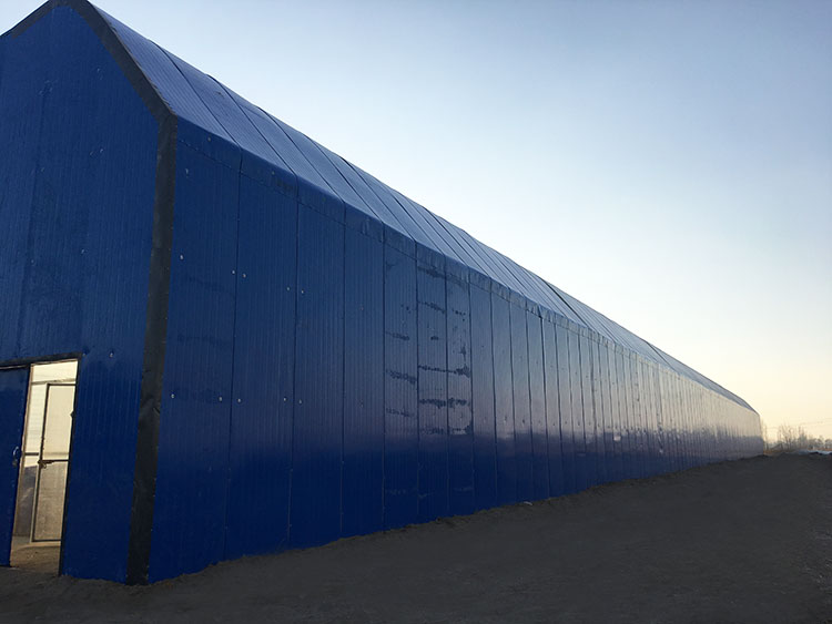 1. 該溫室由全鋼骨架、蓄熱水箱、雙膜單(雙)被等裝配而成,結構輕便,采光角度科學合理,實現了通風和卷簾的自動控制。具有采光和保溫性能好、蓄放熱量大、承載力強等特點。