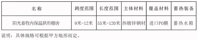 陽光畜牧內保溫拱形棚舍配套設備包括:棚舍主體、骨架系統、外覆蓋系統、內保溫系統、內膜系統、放風系統、新型蓄熱裝置等。
