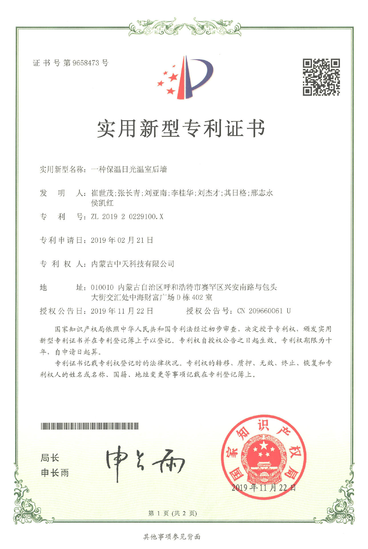2019年11月22日,公司經(jīng)過(guò)長(zhǎng)期對(duì)日光溫室的研究、實(shí)驗(yàn)、改進(jìn)終于又獲得了2項(xiàng)實(shí)用新型專利證書,分別是一種保溫日光溫室后墻和一種保溫日光溫室水蓄熱系統(tǒng)。一種保溫日光溫室后墻是采用全鋼骨架,具有結(jié)構(gòu)輕便、采光角度科學(xué)合理和承載力強(qiáng)等特點(diǎn),一種保溫日光溫室水蓄熱系統(tǒng)是由蓄熱水箱組成,具有保溫性能好、蓄放熱量大等特點(diǎn)。